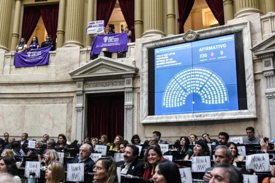 La Cámara de Diputados aprobó, en un primer momento, la Ley Olimpia, el 5 de julio, después fue sancionada en el Senado el 30 de agosto (por unanimidad) y, finalmente, volvió a Diputados para correcciones técnicas que fueron subsanadas y se procedió a su aprobación. En el primer paso la ley fue aprobada por amplia mayoría con 191 votos a favor. Los dos votos en contra fueron de Javier Milei y Victoria Villarruel (La Libertad Avanza) y también se registró una abstención de Carlos Zapata (Ahora Patria en alianza con La Libertad Avanza). Estuvieron ausentes Carolina Píparo (La Libertad Avanza) y José Luis Espert (Avanza Libertad ahora en Juntos por el Cambio). En la sesión del 11 de octubre a la madrugada (la norma se aprobó a las 4 de la mañana) Milei, Villarruel y Píparo estuvieron ausentes.