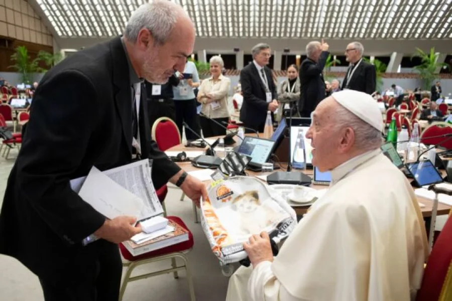 El padre Dante contó que en la segunda semana del Sínodo «pude saludar al Papa Francisco y entregarle algunos presentes que le han enviado desde La Rioja. Uno de ellos era una mochila realizada con bolsas recicladas de alimento de mascotas que han diseñado alumnos de 7mo grado del Colegio Pio XII, a través de un proyecto inspirado en la encíclica del Papa ‘Laudato Si’. Grande fue la sorpresa de Francisco al ver esta iniciativa, valorando el trabajo y agradeciendo que se estén realizando cosas concretas para cuidar el Planeta, nuestra Casa Común»