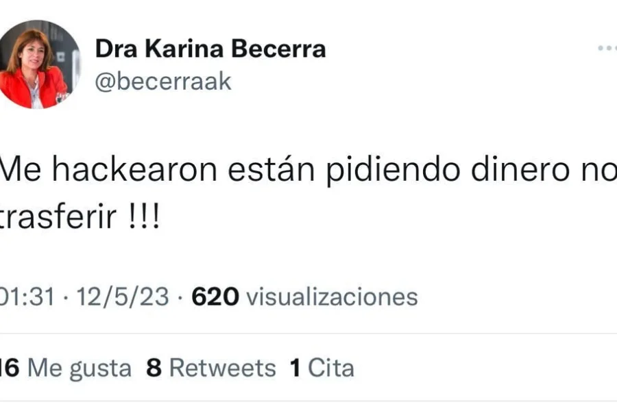El hecho fue confirmado por la misma doctora Karina Becerra, quien mediante su cuenta de Twitter publicó: “Me hackearon están pidiendo dinero no trasferir !!!”.