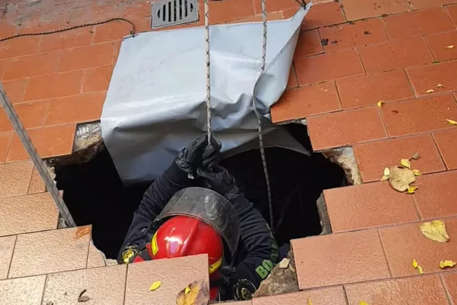 En los videos que se conocieron del caso se pudo observar la importante abertura en el piso que le valió la fuerte caída a Matilde y el trabajo de los socorristas para rescatar a la jubilada.