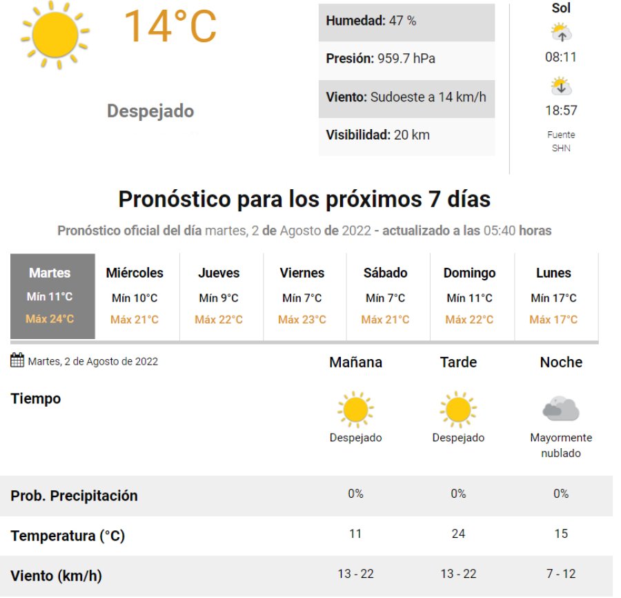 El Servicio Meteorológico Nacional informa que la temperatura actual en La Rioja es de 14 grados, con una humedad del 47%. Soplan vientos del sector sudeste a 14 kilómetros por hora. No hay probabilidad de precipitaciones.