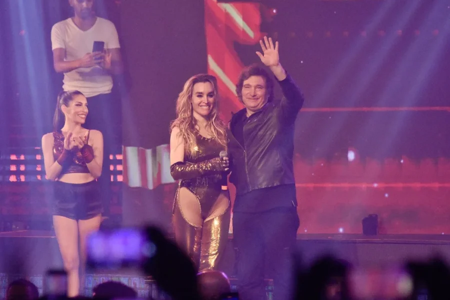 Igual que la primera vez que fue, Milei subió al escenario al finalizar la función y cuando acercaron a la actriz una torta para apagar las velitas en el día de su cumpleaños.