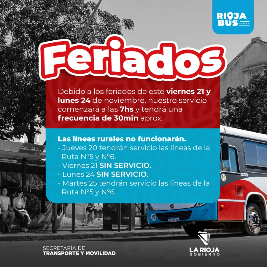 En cuanto a las líneas rurales, el viernes 21 y lunes 24, no habrá servicio. “Saldremos el jueves 20 y martes 25 de noviembre, hacia las Rutas 5 y 6”, indicaron, al mismo tiempo que recordaron que los días domingo no brindan servicio, y que los beneficios BEG y BUG, NO funcionan los días feriados.