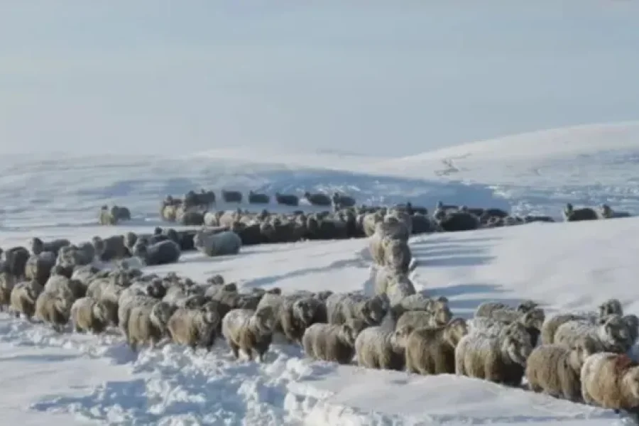 En un video que circula en redes sociales, se puede ver al camarógrafo caminando por la espesa nieve en la provincia de Chubut, filmando varios ovinos enterrados, a excepción de sus cabezas, observándolo.