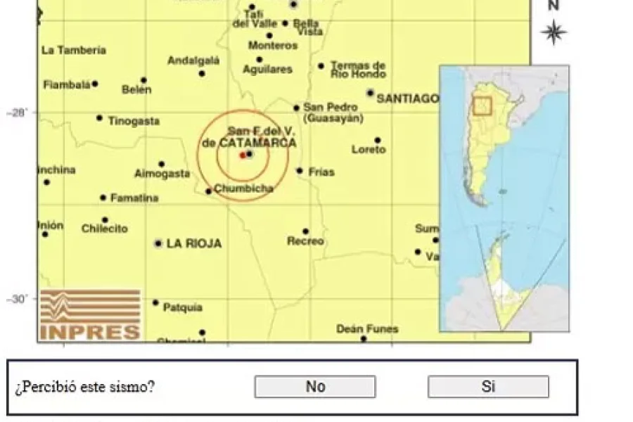 El primer sismo fue exactamente a las 15.35 con una magnitud de 2 grados en la escala de Richter, según informó INPRES. El epicentro fue a 8 kilómetros al oeste de la Capital y a 56 kilómetros al noreste de Chumbicha, con una profundidad de 3 kilómetros.