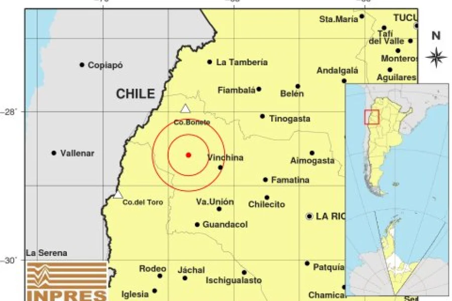 El INPRES confirmó que el fenómeno se produjo en la región Oeste, cerca de la precordillera, ya que el epicentro fue situado a 34 km al sudeste de Laguna Brava, a 50 km al oeste de Vinchina y a 69 km al sur de Cerro Bonete.