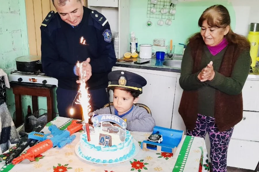 Los encargados de cumplir el sueño al niño fueron los efectivos policiales de la Base Operativa del barrio San vicente, que con la autorización de la jefatura de la Policia de la Rioja, fueron hasta el domicilio del cumpleañero y le cantaron el feliz cumpleaños.