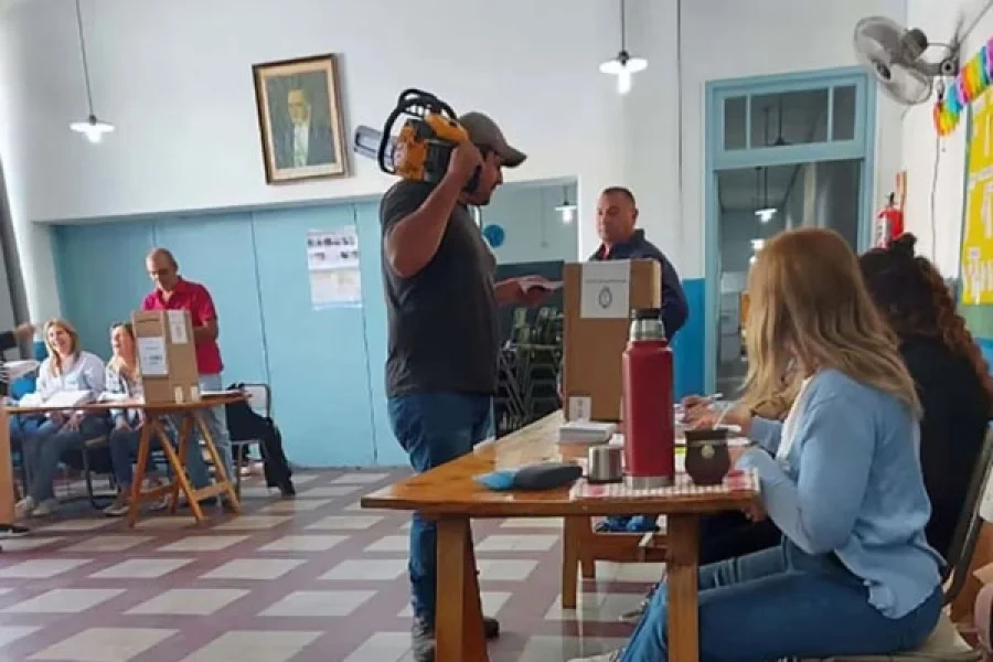 En este balotaje, hubo un imitador. Esta vez no era una máscara, sino una motosierra real. Sucedió en la mesa 105 de la localidad de Mones Cazón del partido de Pehuajó, en la provincia de Buenos Aires.