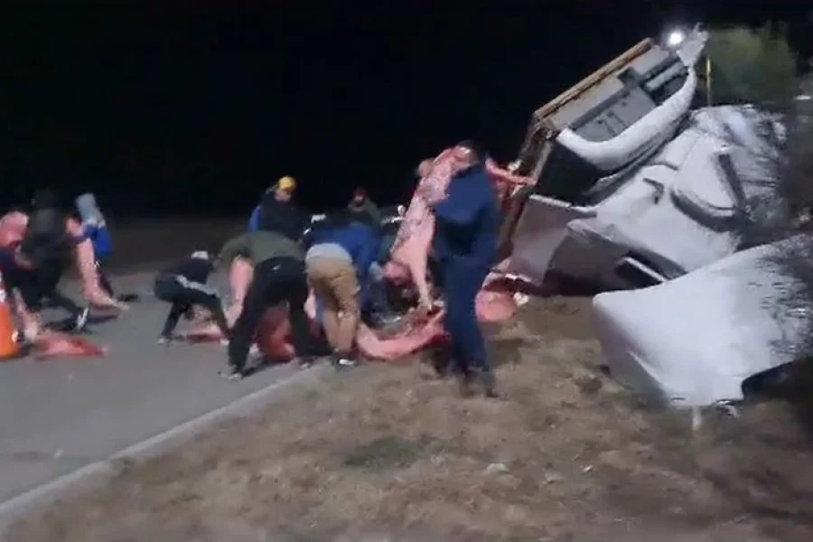Un camión Mercedes Benz que transportaba carne volcó esta madrugada de jueves en la Autopista de las Serranías Puntanas, a la altura de la localidad de Fraga, y los vecinos alertados sobre lo ocurrido se llevaron parte de la carga.