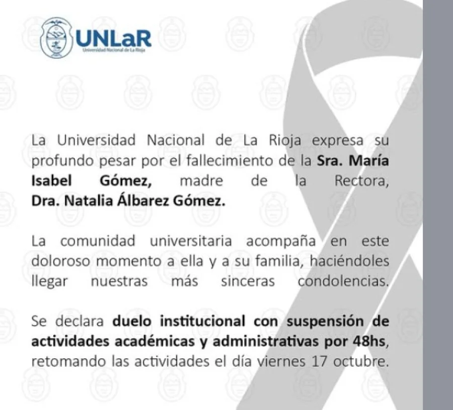 La Universidad Nacional de La Rioja (UNLaR) comunicó con profundo dolor el fallecimiento de la Sra. María Isabel Gómez, madre de la rectora, Dra. Natalia Álvarez Gómez.