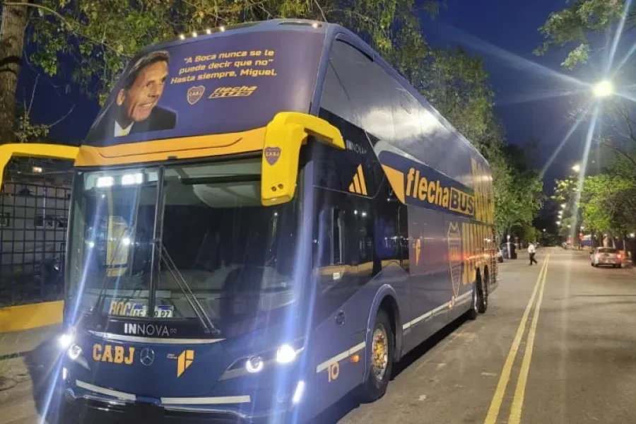 El micro de Boca que traslada a los jugadores presentó un ploteo en homenaje a Miguel Ángel Russo. Sobre la parte superior delantera del vehículo se observa una imagen del entrenador que falleció el miércoles y a su lado una de sus frases más conocidas dedicadas al Xeneize.