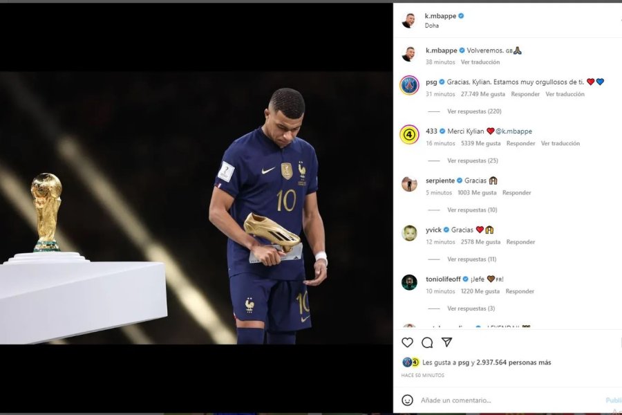 El posteo de Mbappe está lleno de mensajes alentadores, de amigos, compañeros y de amantes del fútbol que lo felicitan por su gran torneo.