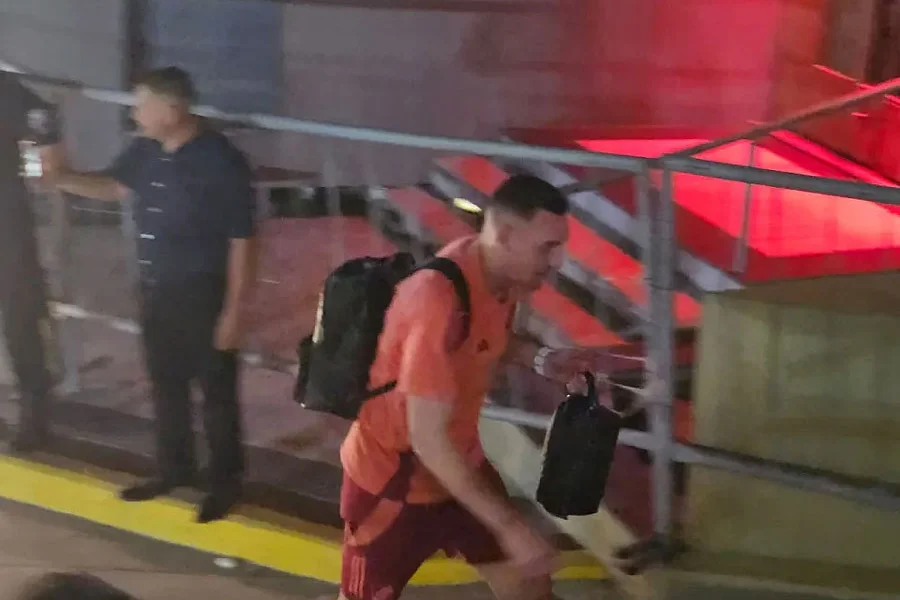Pasadas las 21.35 el colectivo que trasladaba al plantel millonario llegó al hotel Del Bono donde se hospeda de cara al partido de River con San Martín de mañana a las 21.30 en Concecpión por la Liga Profesional.