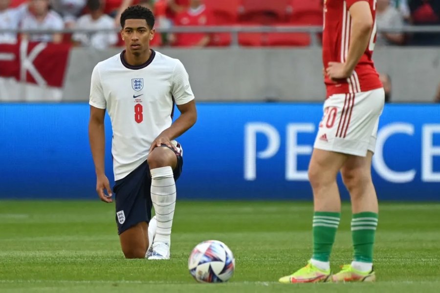 La selección inglesa lleva a cabo este gesto desde 2020, a raíz de la muerte del afroamericano George Floyd durante su detención en EE UU, ya que es una forma de protesta contra el racismo, muy común en los países anglosajones.