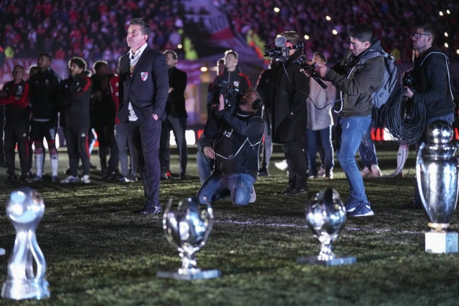El entrenador tomó el micrófono y le dedicó unas palabras a los hinchas. “Sinceramente no sé por dónde empezar. Mi vínculo con River me hizo ser un privilegiado. Jamás en mi vida soñé con vivir algo así. O si lo soñé, era algo muy mío. Y estar en este momento, en este lugar, con miedo de expresarme, porque esto es demasiado... Tengo muchos recuerdos, pero quiero empezar recordando en este día de la madre a la mujer que me dio la vida, que seguramente me estará viendo desde algún lugar de privilegio, allá en el cielo. ¡Feliz Día de la Madre! Yo a la mía la recuerdo con mucho cariño. Era la que esperaba que llegara de cada entrenamiento, que me abrazaba, que me acompañaba a todos lados, hasta el día que se fue... Se sentaba ahí en la platea y me esperaba en el vestuario para darme un abrazo. Así que: ¡Gracias vieja! En algún lugar del cielo donde estés, por haberme dado la vida. Gracias a mi familia, que me sostuvo todo este tiempo. Gracias a todo mi equipo de trabajo; lo valoro, lo respeto y los quiero. Han sido parte de mi cuerpo todo este tiempo. Gracias jugadores. Han pasado muchos jugadores en todo este tiempo, muchísimos. Son los verdaderos protagonistas de lo que podamos trabajar, desarrollar o sentir para que ellos lo lleven a cabo. No tengo más que palabras de agradecimiento de cada jugador que ha tenido la grandeza de vestir esta camiseta, de entregarse al máximo en cada entrenamiento. River me ha enseñado que se trata de una forma de vivir, de ser, y nos ha tocado ganar. Han sido cosas hermosas, imborrables. Quedará siempre para toda la vida. También nos ha tocado perder, y en la derrota me he sentido más orgulloso, porque la vida tiene eso. Te da enseñanza, te permite ser humano, para equivocarte y tener más fuerzas para seguir, y hemos sido eso todos este tiempo”.