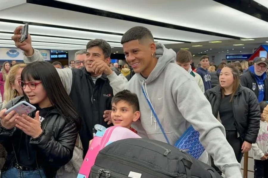 Apenas bajó del avión el futbolista se cruzó con muchas personas que se encontraban en el aeropuerto que lo siguieron para sacarse fotos y llevarse un recuerdo. Si bien no se detuvo a dialogar con la prensa, al ser consultado sobre cuándo volverá a jugar aseguró: "Esperemos que pronto".