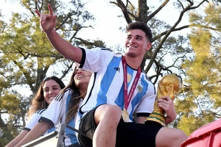 "Buenas tardes a todos. Es difícil hablar en un momento así, en la situación que estamos viviendo los argentinos, la alegría más grande de todas", fue lo primero que expresó Julián Álvarez cuando le dieron el micrófono para que le hable a los fanáticos de Calchín. "Muchas gracias a todos. Agradecido de por vida por el cariño y apoyo, a la gente de Calchín y a la gente de cada rincón del país. Cada día nos sentimos todos más orgullosos de ser argentinos. Es una emoción muy grande. Haber cumplido un sueño es muy difícil describirlo en palabras. Se siente lo que nos tocó vivir", añadió. A su vez, pidió perdón a sus fanáticos: "Aprovecho a pedir disculpas porque no puedo responder todos los mensajes, porque son muchos, pero sepan que los leo, que llegan".