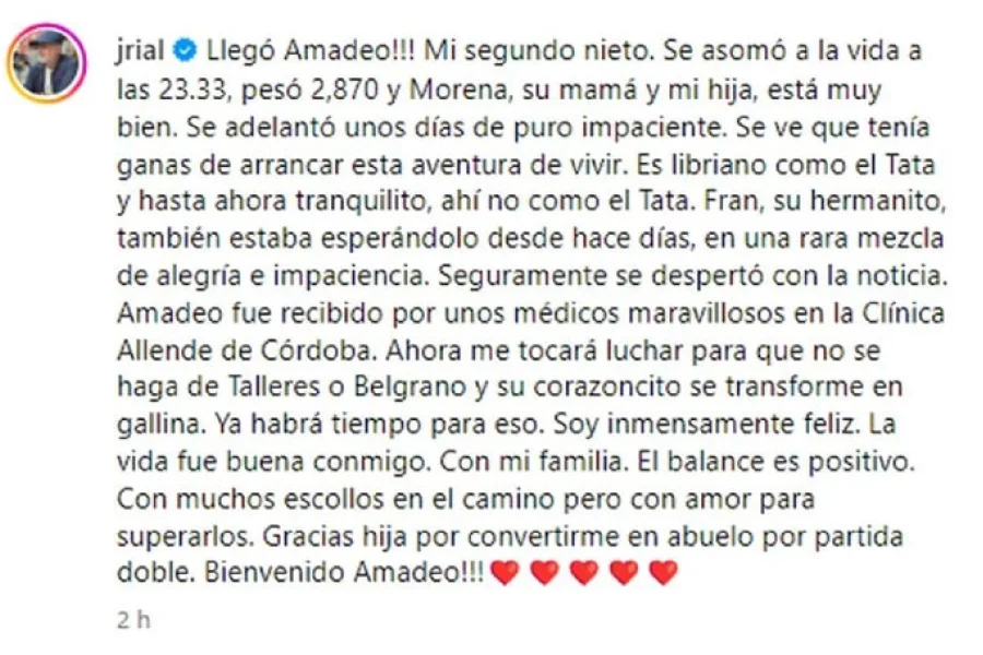 "Llegó Amadeo!!! Mi segundo nieto. Se asomó a la vida a las 23.33, pesó 2,870 y Morena, su mamá y mi hija, está muy bien. Se adelantó unos días de puro impaciente", comenzó el escrito.