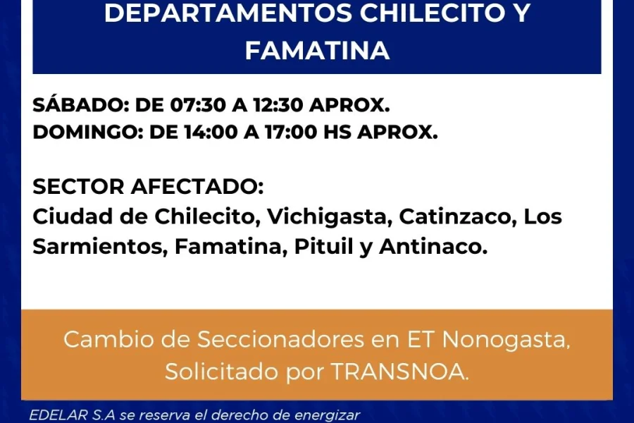 El corte será el sábado de 7.30 a 12.30 y el domingo de 14.00 a 17.00 y el sector afectado será la ciudad de Chilecito, Vichigasta, Catinzaco, Los Sarmientos, Famatina, Pituil y Antinaco.