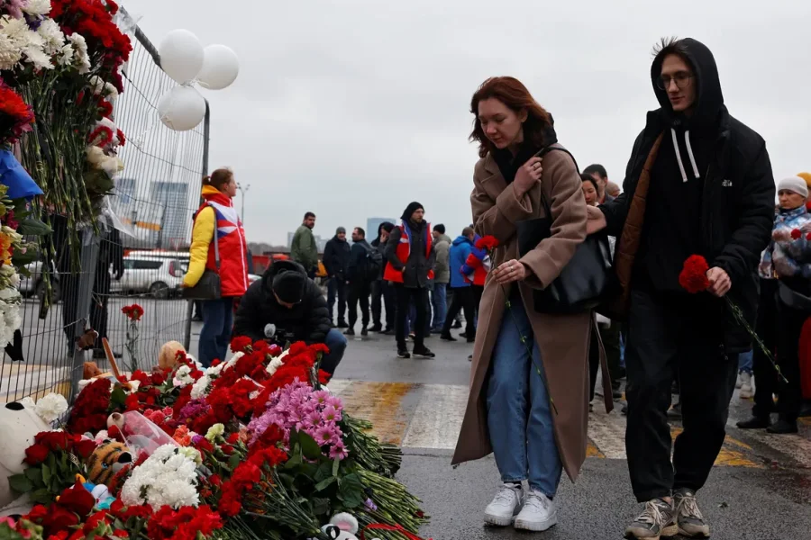 Desde temprano, los ciudadanos rusos depositan flores en las inmediaciones del teatro, porque el perímetro está acordonado y patrullado por grupos caninos y miembros de la Guardia Nacional Rusa, al tiempo que los servicios de rescate continúan limpiando escombros del edificio, destruido por el incendio causado por los asaltantes.
