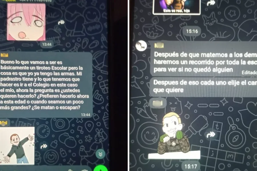 “Bueno, esto es así. Vamos a entrar por la entrada principal como siempre y luego irán dos arriba y dos abajo… acá no es que ustedes elijan a quien mierda le van a disparar, persona que ven, persona que le disparan sin importar el que le toca. ¿Okey? No quiero que se arrepientan a último momento. Si es así créanme que no me gusta gastar mi tiempo. Ya sea estando en la escuela, lo siento mucho, pero los disparos no serán solo para los estudiantes, si no para el que se arrepiente también”, expresa un mensaje en el grupo “Tiroteo escolar” donde hay cerca de 10 alumnos.