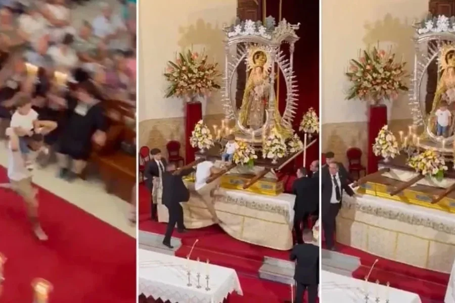 Un hombre sorprendió a todos al entrar corriendo en una iglesia con un nene sobre sus hombros con la intención de subir al altar y dejarlo a los pies de la imagen de una virgen, ante la mirada asombrada de los presentes.