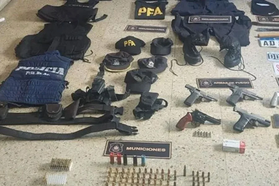 De acuerdo a lo manifestado por los informantes, al requisar la vivienda, los funcionarios encontraron partes de uniformes de diversas instituciones (de la Policía de la Provincia de Buenos Aires, de la Policía Federal Argentina y de la Gendarmería Nacional), dos linternas con picanas, una maza, cortafierros, barretas, pasamontañas, guantes, varias chapas de vehículos, handies, algunos precintos plásticos, dos revólveres, dos pistolas (una 11.25 y otra nueve milímetros), una réplica de un arma de fuego, un chaleco antibalas, gran cantidad de municiones de grueso calibre, una granada de fragmentación FMK2 de fabricación argentina (que tuvo que ser detonada por los expertos de la División Explosivos), entre otros elementos.