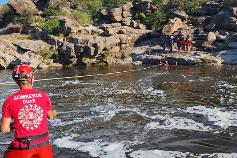 Personal del DUAR, Bomberos Voluntarios, la Policía y Guardavidas municipales de Mina Clavero se constituyeron en el balneario La Toma para el rescate de un grupo de 20 personas, entre ellos, seis menores de edad.