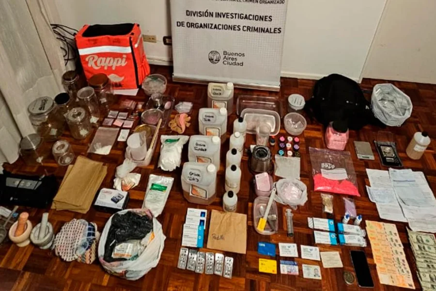 También fueron incautados varios bidones que contenían ketamina, elementos de corte tales como maltoderina y cafeína anhidra, bidones de cinco litros de sustancias químicas varias, potes con colorantes y saborizantes, balanzas de precisión, medicamentos de todo tipo en cápsulas y pastillas picadas, recipientes varios, coladores y mezcladoras.