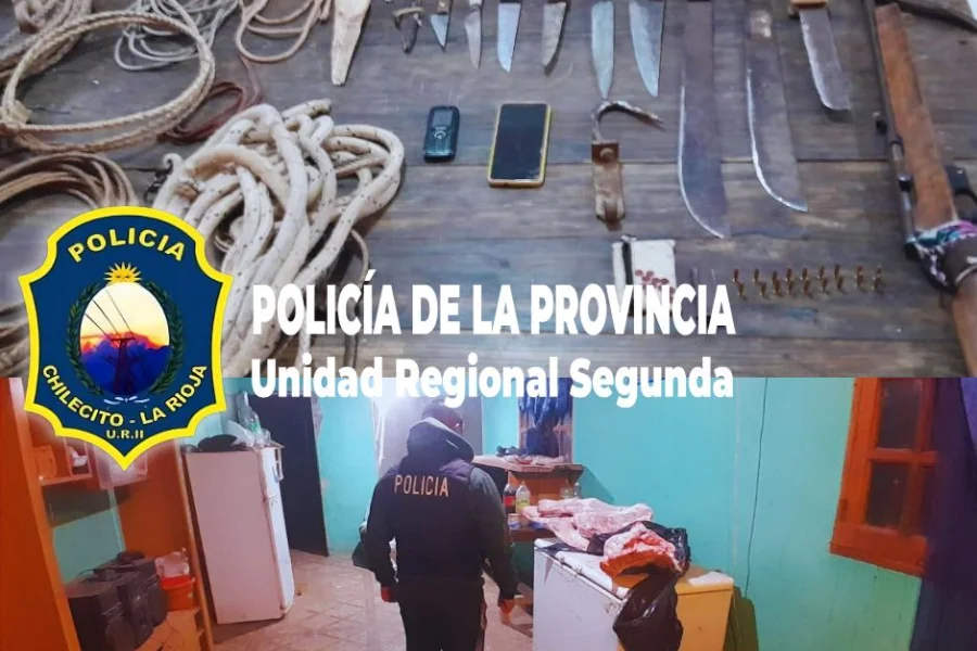 Luego, en el paraje Chucuma, domicilio de otro de los implicados, se secuestró carne vacuna (cortes frizzados). Elementos vinculados al manejo animal, como sogas, bozales, guadillos, machetes y un rifle largo Bersa con municiones.