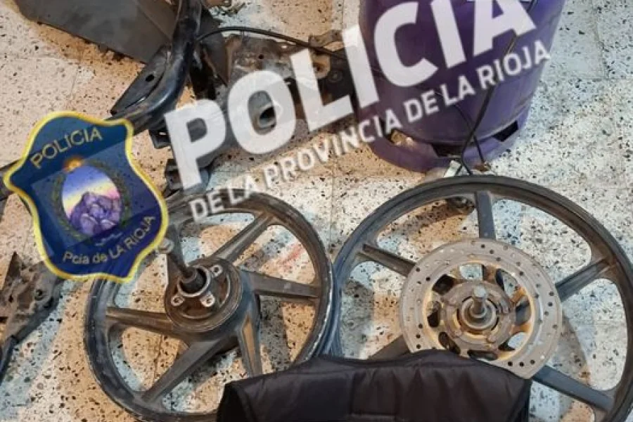 Entre los artículos recuperados se encuentran plásticos de motocicleta 110 cc en colores negro y rojo, dos llantas de aleación pintadas de negro, un cuadro de motocicleta, un asiento con baúl y una garrafa de 10 kg.