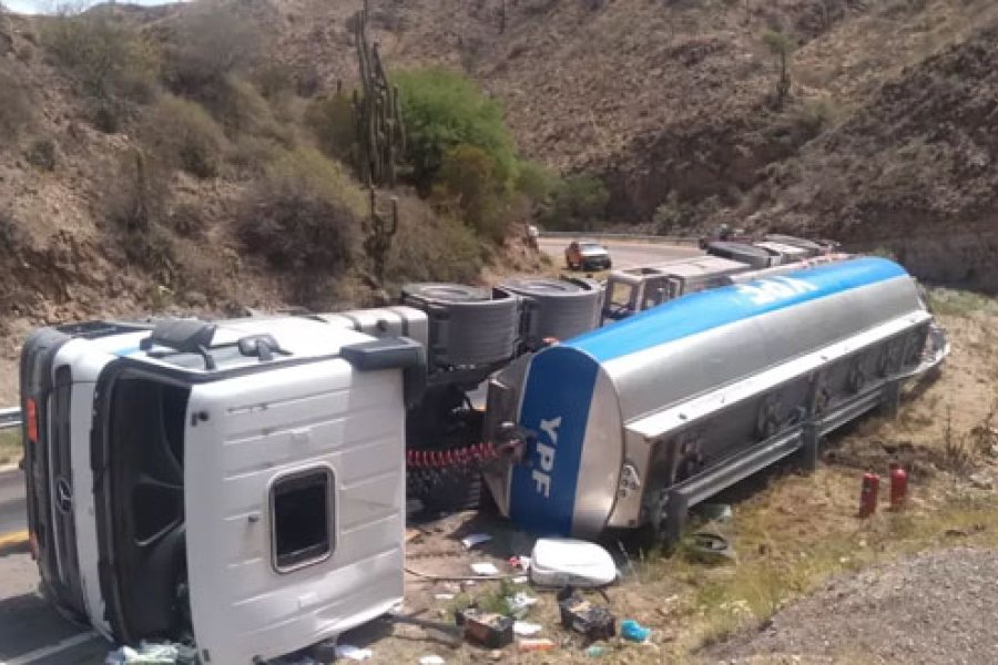 Pasado el mediodía de este lunes, un camión cisterna que transportaba combustible, por razones que aún no se determinaron, perdió el control y terminó volcando sobre la Ruta Nacional 60 al kilómetro 1146 de la Quebrada de La Cébila.