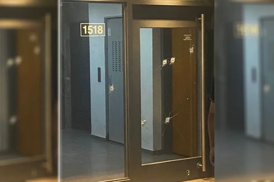 Luego, los peritos constataron que fueron nueve balazos, que impactaron en la puerta de acceso al edificio y también en los vidrios blindex del mismo.