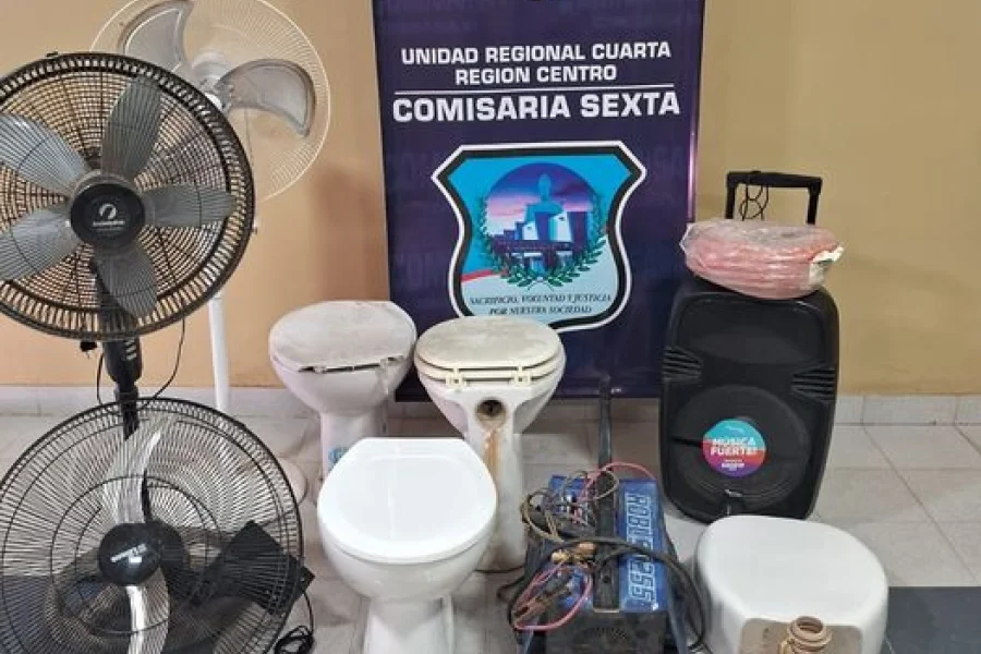 Un parlante Portatil, un rollo de cable corrugado, 2 ventiladores de pie, 3 inodoros, mochila de cerámico para baño, un ventilador de pared, una soldadora. Hechos que fueron denunciados en sede policial y se logró dar con los mismos gracias a la práctica de distintos allanamientos en diversos barrios de nuestra ciudad capital. Personal policial continúa con la investigación a los efectos de poder lograr la aprehensión de los autores.