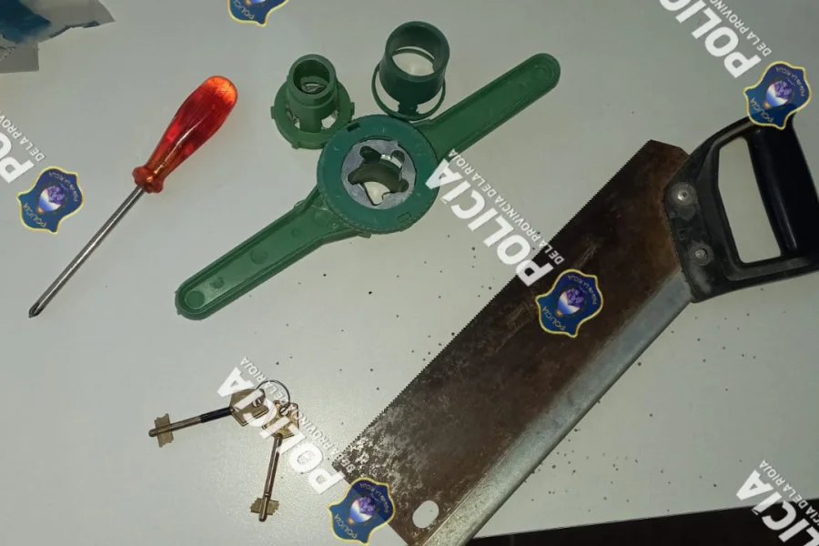 Sumariantes de la comisaria primera de la Perla del Oeste, secuestraron en el lugar allanado: Un serrucho de tamaño mediano, un juego de tarrajas color verde, un destornillador tipo cruz con mango de color naranja y un juego de llaves de color dorado