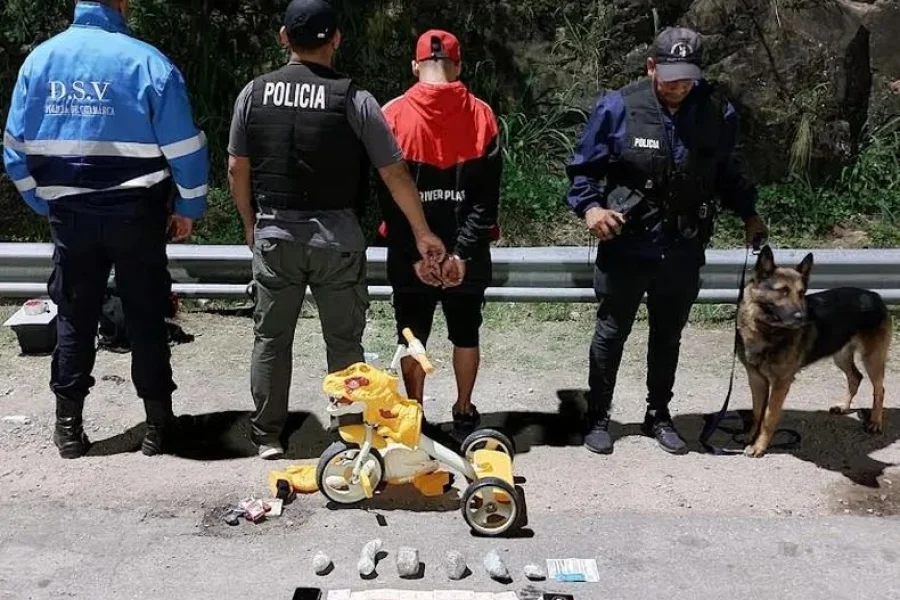 Continuando con el procedimiento, los investigadores identificaron al propietario del triciclo, un joven de 27 años, oriundo de la provincia de La Rioja, a quien al realizarle un palpado superficial le encontraron entre sus prendas de vestir otros envoltorios con la misma sustancia, que también fueron incautados, al igual que la suma de 16.000 pesos en efectivo y un teléfono celular.