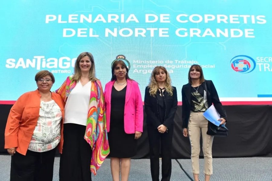 a ministra de Trabajo de la Nación ‘Kelly’ Olmos junto a la subsecretaria de Políticas de Inclusión en el Mundo Laboral, Cecilia Cross, participaron de la jornada “Plenaria de COPRETIS en el Norte Grande” en Santiago del Estero. En representación de La Rioja estuvieron la secretaria de Trabajo de la Provincia, Myriam Espinosa, junto a la directora de Policía de Trabajo, Fátima Maguna, y la coordinadora de COPRETI La Rioja, Alejandra Kuti.
