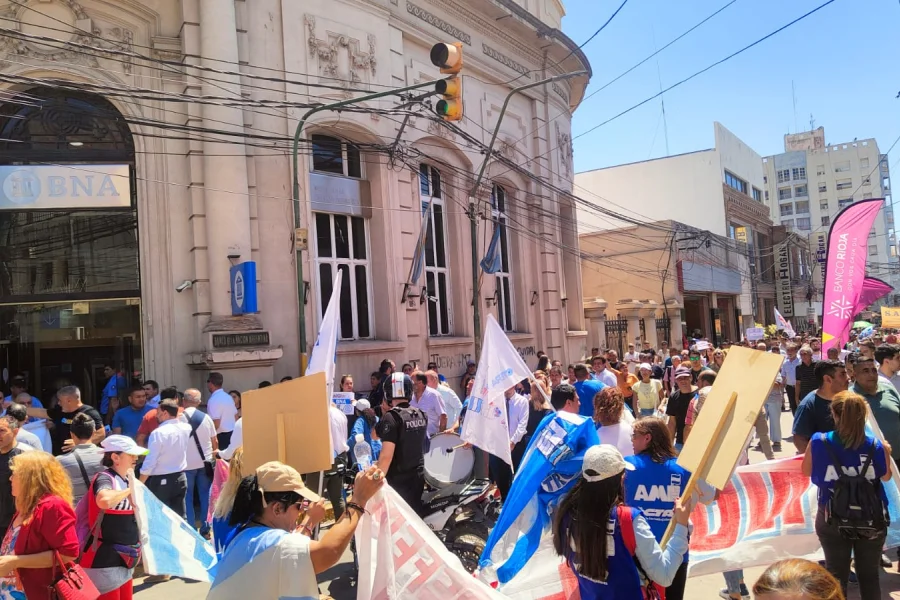 La movilización que se realiza desde las 11hs en la sede del Banco Nación cuenta con un gran acompañamiento de diversos gremios, “Invitamos a todos los sindicatos a que se unan y sepan que la lucha debe ser de todos y no de un sector”, expresó Gómez.