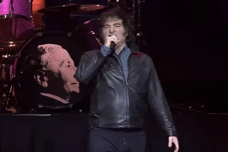 Milei hizo su ingreso al microestadio minutos antes de las 21 y, si bien en el escenario lo esperaba una banda, los organizadores del acto emitieron por los altoparlantes la versión original de “Panic Show” de La Renga, el tema que el mandatario adoptó como leitmotiv desde 2023.