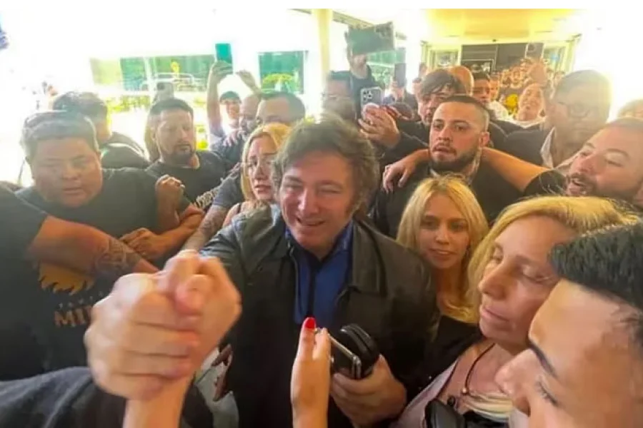 El líder de La Libertad Avanza llegó a la provincia a las 14:00, a bordo de un vuelo de Aerolíneas Argentinas, y fue recibido en el aeropuerto por una multitud que lo vitoreó y por el intelectual e influencer de derecha Agustín Laje, con quien se abrazó efusivamente.