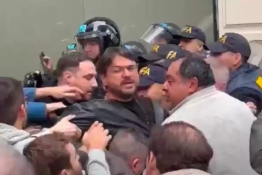 Grabois, junto a parlamentarios como Itai Hagman y Natalia Zaracho y militantes del Frente Patria Grande, ingresaron al edificio a través de una puerta conectada al café contiguo. Desde los balcones ondearon banderas con consignas como “Si no podés elegir, no hay democracia”.