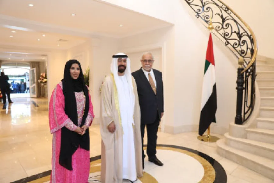 El embajador de Emiratos Árabes Unidos, Said Alquemzi; su esposa, Mouza Almansoori, y su hijo, Saif Alquemzi, recibieron a todos los invitados a la recepción en ocasión del Día de la Unión.