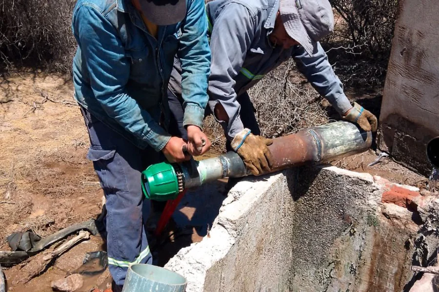 Las tareas de optimización también se concentran en el oeste provincial. En Villa Unión, en la zona de los Drenes, se instaló una nueva bomba sumergible y se aprovechó la maniobra para realizar una optimización integral del sistema, que incluyó la reparación de la cañería de impulsión y la conexión eléctrica para su puesta en marcha. Esta acción estratégica incrementa el aporte de caudal al sistema de distribución local.
