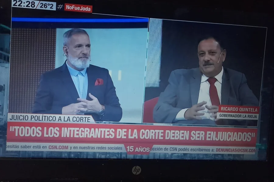 En la ocasión, Quintela mencionó el tema del juicio a los miembros de la Corte Suprema indicando que “la destitución lo decidirá el Congreso de la Nación, pero se hace uso de una herramienta constitucional, que está claramente establecida, donde el Juicio Político a la Corte Suprema, como a cualquier juez, es una herramienta que tiene el poder ejecutivo y el ciudadano para poder iniciar una evaluación sobre la conducta política de los jueces”. “Lo importante es la sustanciación del juicio que permita visibilizar la situación de cada uno de los jueces, sus conductas en este alto cargo que tienen que honrar a la República Argentina, que, si no están ética y moralmente a la altura de las circunstancias, lejos pueden juzgar a la ciudadanía” agregó.