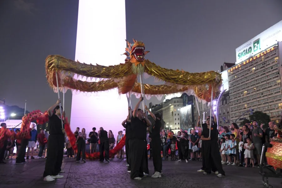 Con la presencia de más de 80 artistas, la comunidad china celebró la llegada de su Año Nuevo, el número 4721 según el calendario lunar de su país, frente al Obelisco con figuras de dos dragones: uno rojo que simboliza la fortuna y buena suerte, y otro amarillo que representa el color imperial chino.