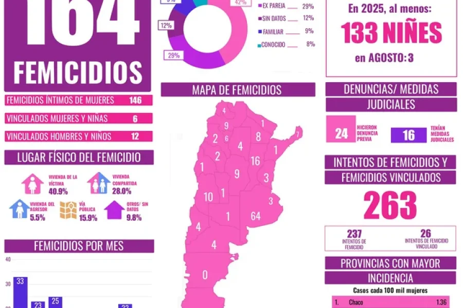 En el país ya hubo 164 femicidios en lo que va del año, de los cuales 15 ocurrieron en agosto. A su vez, otra cifra que pone en jaque la situación actual es que hubo 264 intentos de asesinato de víctimas que sufrieron violencia de género.