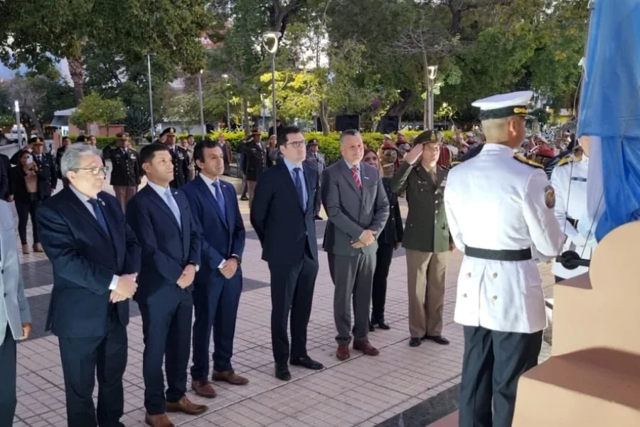 Luego se procedió al izamiento de las banderas Argentina y de La Rioja, para luego realizar las ofrendas florales ante el monumento del Libertador de América, José de San Martín.