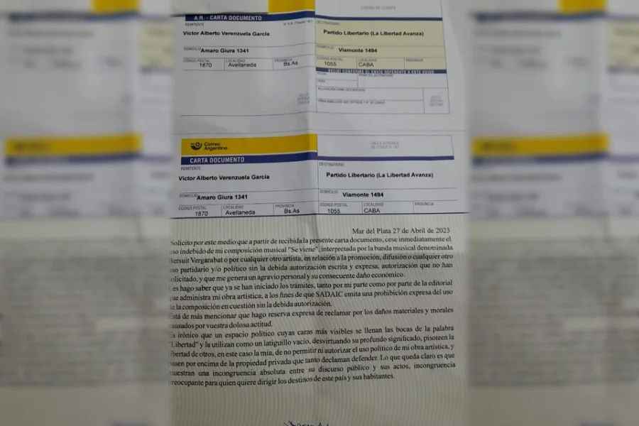 Alberto Verenzuela, autor de la canción y miembro del grupo, envió la carta documento a la sede del partido ultraderechista, en la que pide que cese el uso "sin la debida autorización y expresa", que nunca se pidió. También informa el inicio del trámite, vía Sadaic, para que la entidad no permita el uso indebido del tema y alerta sobre una eventual querella por "daños materiales y morales".