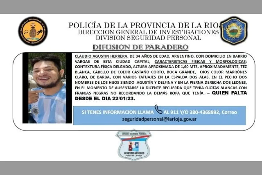 Desde la Dirección de Investigaciones dieron a conocer la búsqueda del paradero de Agustín Herrera de 34 años, oriundo de la Capital riojana.