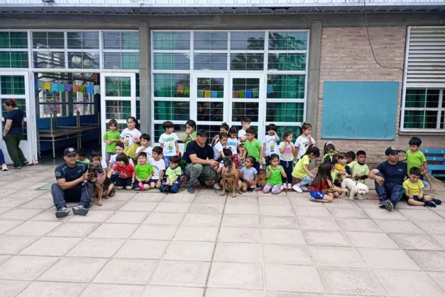 La jornada fue dias atrás, donde personal del Departamento Canes a cargo del comisario Gregorio Rivero junto a tres efectivos policiales realizaron una exhibición en el Jardín de Infantes N° 52 en pleno corazoón del barrio Santa Celia.